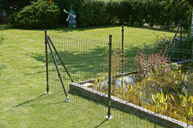 If the local conditions do not allow the Braces to be fixed in the concrete foundation, assembly with drive-in ground sleeves is possible. The Braces run diagonally to the Fence posts and are securely bolted to the Fence post spikes with the Brace plates.