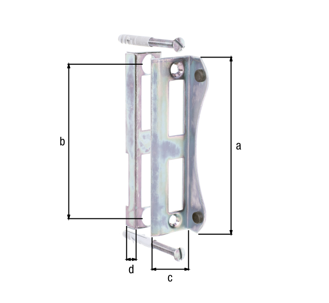 - Un kit se compose d'une partie inférieure, d'une équerre de gâche dotée de deux orifices de fixation pour vis fraisées bombées, de deux vis fraisées bombées avec chevilles correspondantes.